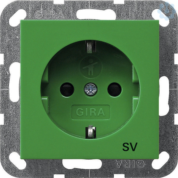 SCHUKO-Steckdose 16 A 250 V~ mit Shutter mit grüner Abdeckung und Aufdruck "SV" (Sicherheitsversorgung) Grün glänzend Hinweise : Erhöhter Berührungsschutz (Safety Plus) gemäß DIN VDE 0620-1.