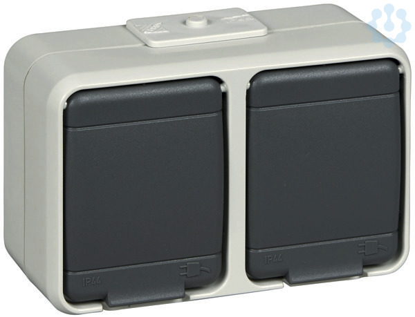 Steckdose 2-fach waagerecht, 16 A 250V AC. Farbe: licht-/basaltgrau, vorverdrahtet, für Aufputzmontage. Schutzart IP 44, mit zwei Leitungseinführungen, Schraubklemmen: Klemmbereich für Kupferleiter 1,5 mm und 2,5 mm, für den sicheren Anschluss von Aluminiumleitern 2,5 mm ohne Vorbehandlung.