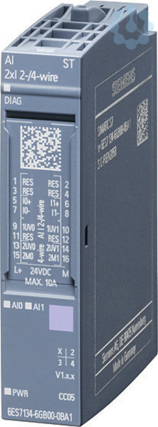 SIMATIC ET 200SP, analoges Eingangsmodul, AI 2xI 2-/4-Wire Standard, Verpackungsmenge: 1 Stück, passend für BU-Typ A0, A1, Farbcode CC05, Modul-Diagnose, 16 Bit Mit SIMATIC ET 200SP bietet Siemens Ihnen ein multifunktionales und dezentrales Peripheriesystem, das aufgrund seiner platzsparenden Bauweise ganz einfach in Betrieb genommen werden kann. Es ist für die Schutzart IP20 zugelassen und für den Einbau in einem kompakten Schaltkasten konzipiert. Das System gewährleistet Ihnen maximale Flexibilität, da Sie die Module aufgrund des Multi Hot Swapping jederzeit schnell und einfach tauschen können. Darüber hinaus bietet Ihnen das SIMATIC ET 200SP ein breites Spektrum an unterschiedlichen sowie schnellen Kommunikationswegen. Aufgrund der Integration des MultiFeldbus Interfacemoduls IM155-6MF sind Sie jederzeit flexibel und können das für Ihre Applikation optimale Protokoll verwenden, da durch diese Funktion mehrere Ethernet Protokolle unterstützt werden. Montage und Service werden durch ein einheitliches Kennzeichnungssystem, das auf Referenzkennzeichnungsschildern und Anschlussbelegungen mit Farbkodierung basiert, vereinfacht. Siemens garantiert Ihnen durch die Einbindung der innovativen und zugleich langlebigen Automatisierungsprodukte Zukunftssicherheit, denn als Branchenexperten setzen sie heute schon auf die Technologien von Morgen und definieren somit die Marktstandards neu. Durchgängige Datenverfügbarkeit, flexible Anwendungsfälle sowie vielseitige Integrationsmöglichkeiten sorgen für die optimale Performance der ET 200 Produkte. Die skalierbare und kostenoptimierte Konfiguration einer ET 200SP - Station wird durch das umfassende Spektrum von Signalbaugruppen gewährleistet. Es stehen neben digitalen und analogen Ein- und Ausgabebaugruppen jeweils auch fehlersichere Varianten für Anwendungen bis SIL 3 / PLe zur Verfügung. Dies gilt ebenso für die integrierten Motorstarter, welche für Motoren bis 5,5 kW geeignet sind. Energy Meter zur Messung und Analyse des Energieverbrauchs, IO-Link Master (V1.1.) sowie viele weitere Kommunikations- und Technologiemodule ermöglichen es dem System sich an jede Automatisierungsaufgabe anzupassen. Das verfügbare Zubehör fürET 200SP reicht von Farb- und Referenzkennzeichnungsschildern bis hin zu Beschriftungsstreifen für die einzelnen Module und sorgt für maximale Übersichtlichkeit im Schaltschrank.