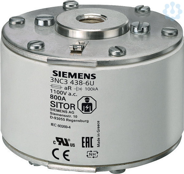 SITOR-Sicherungseinsatz, mit beidseitigem Innengewinde, NH3, In: 1100 A, aR, Un AC: 800 V, Un DC: 440 V, Stirnkennmelder Halbleiterschutzsicherungen SITOR 3NE, 3NC schützen Leistungshalbleiter vor den Auswirkungen eines Kurzschlusses. Das SITOR-Sicherungssystem von Siemens als wichtiger Bestandteil der SENTRON Schutzkomponenten für die Elektroinstallation bietet effektiven Personen-, Geräte- und Anlagenschutz durch sicheres Abschalten im Überlast- und Kurzschlussfall. Der Einsatzbereich umfasst zusätzlich Frequenzumrichter mit Sicherungen im Eingangs- und im DC-Zwischenkreis sowie auch USV-Anlagen und Sanftstarter für Motoren. Die Siemens SITOR-Sicherungen zeichnen sich vor allem aus durch: 1. Superflinke Abschaltcharakteristik im Vergleich zu herkömmlichen NH-Sicherungen. 2. Auch Leistungshalbleiter werden bei Kurzschluss sicher geschützt. 3. Der Siemens Qualitätsstandard sichert eine sehr gute Kennlinientreue. 4. SITOR-Zylindersicherungen sind nach IEC und UL und größtenteils auch CCC zugelassen und damit weltweit einsetzbar. 5. Teilweise geeignet für den Einbau in NH-Sicherungsunterteile, in NH-Sicherungslasttrennschalter und Lasttrennschalter mit Sicherungen.