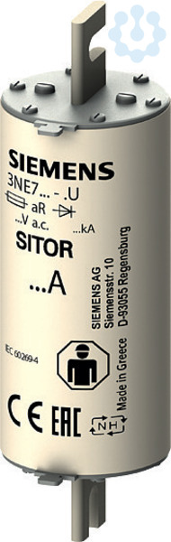 SITOR-Sicherungseinsatz, mit geschlitzten Messerkontakten, NH3, In: 250 A, aR, Un AC: 2000 V, Un DC: 440 V, Stirnkennmelder Halbleiterschutzsicherungen SITOR 3NE, 3NC schützen Leistungshalbleiter vor den Auswirkungen eines Kurzschlusses. Das SITOR-Sicherungssystem von Siemens als wichtiger Bestandteil der SENTRON Schutzkomponenten für die Elektroinstallation bietet effektiven Personen-, Geräte- und Anlagenschutz durch sicheres Abschalten im Überlast- und Kurzschlussfall. Der Einsatzbereich umfasst zusätzlich Frequenzumrichter mit Sicherungen im Eingangs- und im DC-Zwischenkreis sowie auch USV-Anlagen und Sanftstarter für Motoren. Die Siemens SITOR-Sicherungen zeichnen sich vor allem aus durch: 1. Superflinke Abschaltcharakteristik im Vergleich zu herkömmlichen NH-Sicherungen. 2. Auch Leistungshalbleiter werden bei Kurzschluss sicher geschützt. 3. Der Siemens Qualitätsstandard sichert eine sehr gute Kennlinientreue. 4. SITOR-Zylindersicherungen sind nach IEC und UL und größtenteils auch CCC zugelassen und damit weltweit einsetzbar. 5. Teilweise geeignet für den Einbau in NH-Sicherungsunterteile, in NH-Sicherungslasttrennschalter und Lasttrennschalter mit Sicherungen.