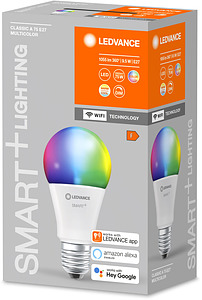 Klassische Kolbenform mit WiFi-Technologie. Produkteigenschaften: Steuerbar über LEDVANCE SMART+ WiFi App (mit mindestens Android™️ 4.4 oder iOS 9.0). Lichtfarbe über Tunable White einstellbar: Warmweiß bis Kaltweiß (2.700…6.500 K). RGB-Farbsteuerung, ca. 16 Mio. Farbmöglichkeiten einstellbar. Dimmbar. Netzwerkprotokoll: WiFi. Lebensdauer: bis zu 15.000 h. Stimmenkontrolle über Hey Google oder Alexa möglich. Produktvorteile: Drahtlose Steuerung über App. Einfache Installation und Nutzung. Enthält kein Quecksilber. Anwendungsgebiete: Allgemeinbeleuchtung. Wohnräume. Gewerbe (Hotels, Bars, Boutiquen usw.). Außenanwendungen nur in geeigneten Leuchten.