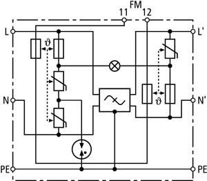Zweipoliger Überspannungsableiter SPS-Protector mit Entstörfilter, Typ 3 nach EN 61643-11. Kombination aus Überspannungsschutz und Filter. Zum Schutz der Netzversorgung von Geräten der Industrieelektronik vor transienten Überspannungen in Schaltschränken. Zum Einsatz im Blitz-Schutzzonen-Konzept an den Schnittstellen 1 – 2 und höher.