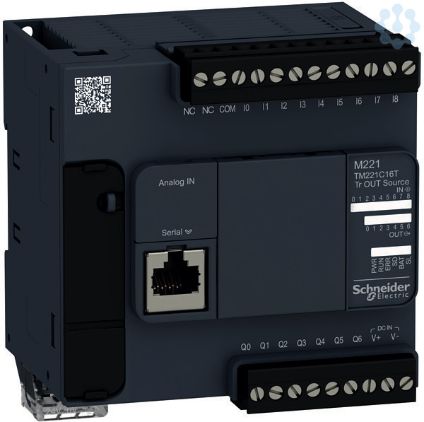 SPS-Steuerung Modicon M221 im Kompaktformat mit 0,2µs / boolsche Anweisung für die Automatisierung von einfachen industriellen Maschinen. Insgesamt 16 integrierte E/A, davon 9 digitale (5 Standard mit 5kHz und 4 HSC mit 100kHz) Eingänge, 7 digitale Ausgänge. Zusätzlich 2 analoge (0V bis 10V / 10Bit) Eingänge. Eine RS485/RS232-Schnittstelle mit RJ45-Buchse für Modbus ASCII/RTU Master/Slave, ASCII character string, Modbus Serial IO Scanner. Die Spannungsversorgung erfolgt über 24VDC. Die digitalen Ausgänge sind als Source-Transistor (0,5A) ausgeführt. Erweiterbar mit bis zu einem Steckmodul. 640 kB integrierter RAM-Speicher und 2 MB Flash-Speicher. Integrierte Regelung für bis zu 2 koordinierte Achsen. Position Control (PTO) mit Trapez- oder S-Profil für 2 Achsen in Pulse-Direction (P/D)-Mode oder eine Achse in CW/CCW-Mode. Ausgestattet mit einem Steckplatz für SD-Karte, einem USB-mini-B-Port zur Programmierung, einem Run/Stop-Schalter und QR-Code für direkten Zugriff auf technische Dokumentation. Lokale und dezentrale E/A-Erweiterung mit Modicon TM3 E/A-System. Programmierung und Konfiguration mittels kostenfreier Software EcoStruxure Machine Expert - Basic (Download über www.se.com). SPS-Programmierung nach IEC 61131-3 in den Programmiersprachen Anweisungsliste (AWL), Kontaktplan (KOP) oder Ablaufsprache (Grafcet Liste/ SFC). Anschluss über abnehmbare Schraubklemmleiste. Umgebungstemperatur im Betrieb -15°C bis +50°C. Montage auf 35mm DIN-Hutschiene oder direkt auf Schalttafel. Zertifiziert nach CE, cULus Listing Mark, CSA, RCM, EAC, LR, ABS, DNV-GL, cCSAus Gefahrenzone.
