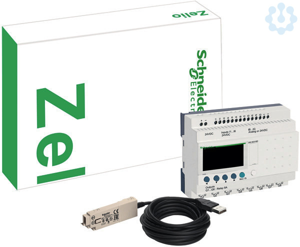 Starterkit für Zelio Logic in modularer Ausführung (SR3). Das Set besthet aus 1x Zelio Logic (SR3B261BD) und 1x Programmierkabel (SR2USB01).