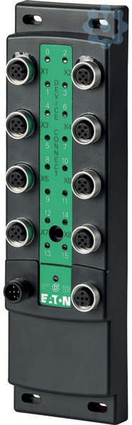 SmartWire-DT Teilnehmer in Schutzart IP69K zum Anschluss von 16 digitalen Ein- und Ausgängen, E/A-Typ konfigurierbar, Sensorversorgung je M12 Buchse 24 V DC 70 mA kurzschlussfest, automatische Adresseinstellung, digitale Ausgänge 24 V DC 0,5 A kurzschlussfest, E/A-Anschluss mit Buchse M12 für je zwei Ein-/Ausgänge