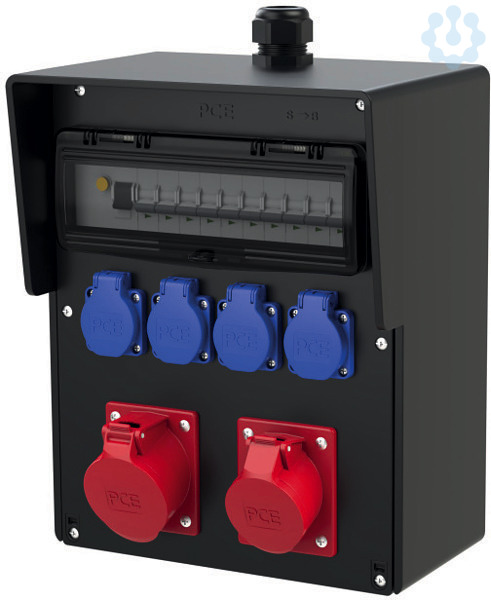 Vollgummi-Wandverteiler Typ SALZBURG IP54 298x370x203 BOTmo.; 1xM32 Verschraubung oben (Kabeldurchm. 18-25mm PG29) schwarz; 1xCEE-Steckdose 32A 5p 400V abgesichert ü. 1xLS 32A 3p C; 1xCEE-Steckdose 16A 5p 400V abgesichert ü. 1xLS 16A 3p C; 4xSK-Steckdose 16A 250V IP54 abgesichert ü. 4xLS 16A 1p C; 1xFI 63A/4/0.03A (TYP A 63AT) über alle Ausgänge; Leitungsschutzschalter und FI Fabrikat Eaton ÖVE / VDE; Verteiler auf HKL-Klemme (max.5x25qmm/5x16qmmYF!) verdrahtet;