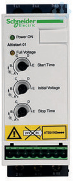 Dieser Altistart 01-Softstarter wird auf DIN-Schiene montiert und kann 3-Phasen-Asynchronmotoren mit einer Leistung von bis zu 6 A speisen. Dieser Altistart 01 kann für einen Motor mit einer Nennleistung von bis zu 1,1 kW oder 1,5 PS für 3 Phasen (200 V bis 240 V AC) verwendet werden. Dieser auf einer DIN-Schiene montierte Sanftanlasser ermöglicht den sanften Start von einfachen Maschinen wie Förderbändern, Pumpen, Ventilatoren, Kompressoren, automatischen Türen und Toren, kleinen Kränen und riemengetriebenen Maschinen. Er ist 45 mm breit, das macht ihn zu einem der kleinsten Softstarter auf dem Markt; er kann fast überall eingebaut werden. Er verfügt über einen integrierten Bypass, der die Geräuschentwicklung und die Wärmeabgabe reduziert. Einfaches Setup mit nur 2 Einstellungen: auch von Nicht-Fachleuten zu konfigurieren. Er sorgt für einen sanften Anlauf Ihrer Maschinen, vermeidet mechanische Beanspruchungen und verlängert deren Lebensdauer.