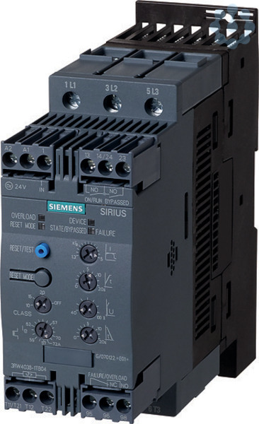 SIRIUS Sanftstarter S2 45 A, 30 kW/500 V, 40 °C AC 400-600 V, AC/DC 24 V Schraubklemmen Thermistormotorschutz Sanftstarter SIRIUS 3RW40 für Standardanwendungen zum sanften An- und Auslauf von Drehstromasynchronmotoren.Stufenloses Starten, Reduzieren von Stromspitzen, Vermeiden von Netzspannungschwankungen im Anlauf, Entlasten des Stromversorgungsnetzes, Verringern der mechanischen Belastung im Antrieb, erhebliche Platz- und Verdrahtungsersparnis gegenüber Stern-Dreieck-Startern und Frequenzumrichtern, wartungsfreies Schalten und einfachste Handhabung. Der integrierte Bypass ermöglicht die sehr kompakte Bauweise und sorgt für eine geringere Erwärmung im Schaltschrank. Intelligente Überwachungsfunktionen schützen den Sanftstarter vor Überhitzung und den Motor vor Überlast. Zudem können Sie den Strom während des Hochlaufs auf einen einstellbaren Maximalwert begrenzen. Mit dem integrierten Fern-Reset können Sie Störungen schnell und einfach aus der Ferne beheben. Weltweite Zulassungen (z.B. IEC und UL/CSA) auch für explosionsgefährdete Applikationen (ATEX bzw. IEC Ex).Verfügbar sind die Sanftstarter 3RW für Netze bis 690 V in einem großen Leistungsbereich mit unterschiedlichen Steuerspeisespannungen und durchgängig mit Schraub- und Federzuganschluss. Bei 3RW30/40 gibt es zusätzliche Varianten mit 24 V Steuerspeisespannung. Einige der 3RW40 bis Baugröße S3 sowie alle 3RW44 bieten zudem einen Thermistormotorschutz.Mit dem optionalen Verbindungsbaustein können die Sanftstarter an die Leistungsschalter angebaut werden, sogar für die Varianten mit Federzuganschluss. Der optionale Lüfter ermöglicht eine noch dichtere Bauweise im Schaltschrank.Einfach, effizient, immer aktuell - der SIRIUS Systembaukasten.