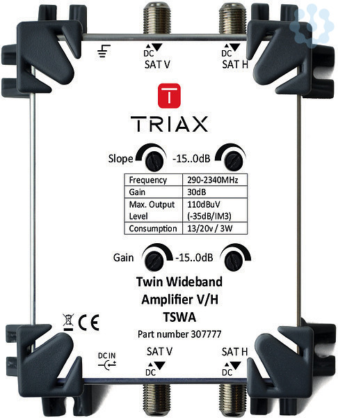 Wideband Verstärker mit zwei Eingängen und regelbarer Verstärkung. Der TWSA-Verstärker ist für Breitbandanwendungen konzipiert, bei denen Satellitenfrequenzen von 290 MHz bis 2340 MHz verwendet werden und kann als Vor- oder Nachverstärker in einer Multischalterkaskade eingesetzt werden. Verstärkung und Entzerrung getrennt regelbar DC-Eingang zur Versorgung von Verstärker und LNB