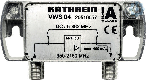 Sat-ZF-Verstaerker, 5-862 950-2150 MHz, Verst. SAT typ. 14-17 dB, pass. Umgehung 5-862 MHz, Fernspeisung typ. Plus12 bis Plus20 Volt, F-Connector