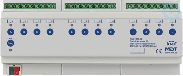 Schaltaktor 12-fach, 12TE, REG, 16/20 A, 230 V AC, C-Last, Industrie, 200 µF, mit Strommessung. Industrieausführung mit bistabilen Relais Strom max. 16/20 A, kapazitive Last max. 200 µF. Taster für Handbetrieb und LED Anzeige je Kanal. Schließer- und Öffnerbetrieb. Zeitfunktionen (Ein-/Ausschaltverzögerung, Treppenlichtfunktion). Rückmeldefunktion (aktiv/passiv) für alle Kanäle. Logische Verknüpfungen, 8 Szenen je Kanal. Betriebsstundenzähler. Zentralfunktionen und Sperrobjekte zur Zwangsführung. Einstellbares Verhalten bei Busspannungsausfall/-wiederkehr. Alle L- Anschlüsse getrennt. Integrierte true RMS Strommessung (Stromstärke, kW). Strommessbereich 10 mA bis 20 A. Schnelle Reaktion <1s bei Master/Slave Betrieb. Integrierte Zählerfunktion des Energieverbrauchs (Wh/kWh). Schneller Download der Applikation (long frame support für ETS5). 3 Jahre Produktgarantie.