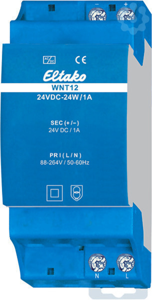 Weitbereichs-Schaltnetzteil. Nennleistung 24W. Stand-by-Verlust nur 0,2 Watt. Reiheneinbaugeräte für Montage auf Tragschiene DIN-EN 60715 TH35. 2 Teilungseinheiten = 36mm breit, 58mm tief. Bei einer Belastung größer als 50% der Nennleistung und immer bei nebeneinander liegenden Schaltnetzteilen ab 12 Watt Nennleistung und bei Dimmern ist beidseitig 1/2 Teilungseinheit Lüftungsabstand mit den Distanzstücken DS12 erforderlich. Weitbereichs-Eingangsspannung 88-264V AC (110V- 20% bis 240V +10%). Wirkungsgrad 24V DC 87%. Stabilisierte Ausgangsspannung ±1%, geringe Restwelligkeit. Kurzschlussfest. Überlast- und Übertemperatursicherung durch Abschalten mit automatischem Zuschalten nach der Fehlerbeseitigung (Autorecovery-Funktion).