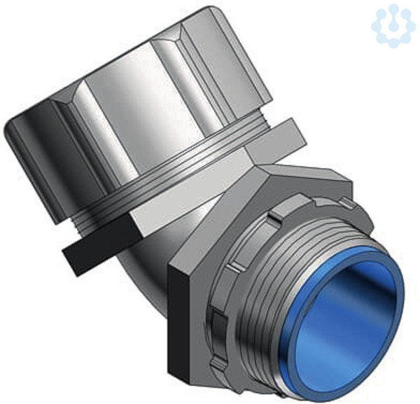 45° - abgewinkelte Metall-Verschraubung, fuer fluessigkeitsdichte Metall-Schutzschlaeuche, aus galvanisiertem Stahlguss mit verchromter Oberflaeche, Innenhuelse aus Polyamid, Nenngroeße 1 Zoll bzw 32 mm, Gewindeanschluss NPT 1 Zoll, Schutzklasse IP67