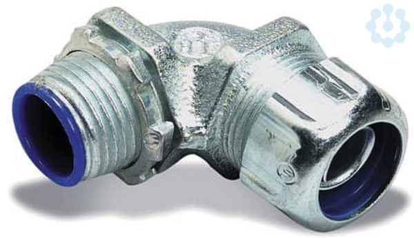 90° - abgewinkelte Metall-Verschraubung, fuer fluessigkeitsdichte Metall-Schutzschlaeuche, aus galvanisiertem Stahlguss mit verchromter Oberflaeche, Innenhuelse aus Polyamid, Nenngroeße 1 1/2 Zoll bzw 50 mm, Gewindeanschluss NPT 1 1/2 Zoll, Schutzklasse
