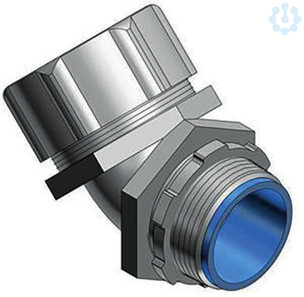 45° - abgewinkelte Metall-Verschraubung, fuer fluessigkeitsdichte Metall-Schutzschlaeuche, aus galvanisiertem Stahlguss mit verchromter Oberflaeche, Innenhuelse aus Polyamid, Nenngroeße 2 Zoll bzw 63 mm, Gewindeanschluss NPT 2 Zoll, Schutzklasse IP67
