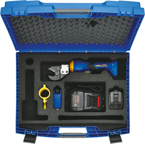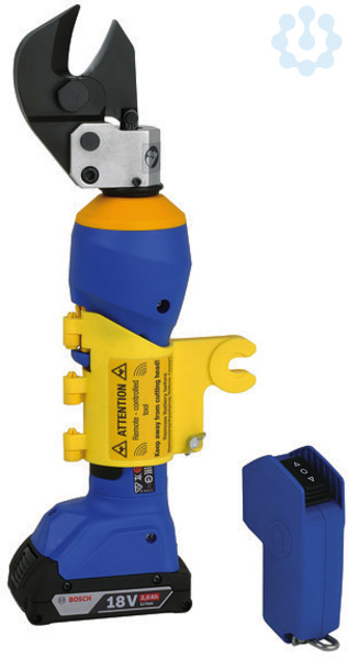 ES 20 RMC Akkuhydraulisches Schneidwerkzeug Ø 20 mm, Werkzeug mit Fernbedienung, z.B. für Teleskopstangen, zum Schneiden von Al/St-Seilen (ACSR) nach DIN EN 50182, massive Al/Cu-Kabel nach DIN EN 60228 Klasse 1 und Cu-Lamellen-Schienen, extrem robuste Bauform bei geringem Eigengewicht, schlanker Schneidkopf - ideal bei kritischen Platzverhältnissen, alle Werkzeugdaten im Blick dank Display und i-press® App, leistungsstarker 18 V Li-Ion-Akku - hohe Kapazität, kurze Ladezeit, auch als normaler Kabelschneider einsetzbar, wenn der Hotstick-Halter nicht angebracht wird