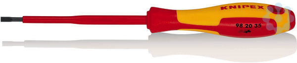 98 20 35 Schraubendreher für Schlitzschrauben Ergonomisch optimierter 2-Komponenten-Griff für ermüdungsarme und handschonende Kraftübertragung. Rollhemmende Griffform. - Klingenlänge: 100mm - unisolierte Klingenlänge: 15mm - Grifflänge: 102mm - Schneidenbreite: 3,5mm - Schneidendicke: 0,6mm - VDE-geprüft: Ja