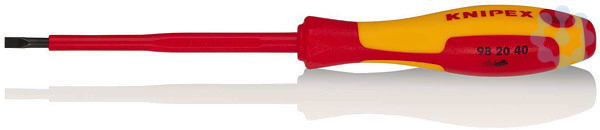 98 20 40 Schraubendreher für Schlitzschrauben Ergonomisch optimierter 2-Komponenten-Griff für ermüdungsarme und handschonende Kraftübertragung. Rollhemmende Griffform. - Klingenlänge: 100mm - unisolierte Klingenlänge: 15mm - Grifflänge: 102mm - Schneidenbreite: 4,0mm - Schneidendicke: 0,8mm - VDE-geprüft: Ja