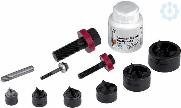 Schraublocher-Sätze Diamant; 11-Teilig mit verschiedenen Größen. Geeignet für Stahlblech (ST 37), Kunststoff und Aluminium. Betätigung erfolgt manuell und hydraulisch. Ausführung: bestehend aus Spalt-Stempeln und Matrizen. Aufbewahrung in einem praktischem, stabilem Kunststoff-Koffer. Zusätzliche Ausstattung mti Kugellager-Zugschrauben (gekapselt), Vorbohrer und Montagepaste. Nennmaß metrisch 12 mm mit einer max. Materialstärke von 1,5 mm; Nennmaß 16/20/25 und 32 mm, mit einer Materialstärke von bis zu 2,0 mm und 40 mm bei einer Materialstärke bis zu 3,0 mm.