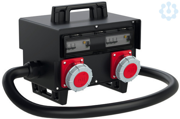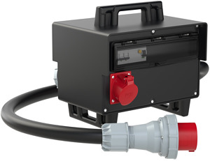 Mobiler Vollgummiverteiler Modell SCHREMS IP54 255x400x300; 2m Kabel H07RN-F 5G35mm2 schwarz mit Stecker 125A 5p 400V; 2xCEE-Steckdose 63A 5p 400V abgesichert ü. 2xLS 63A 3p C (vor FI); 1xCEE-Steckdose 32A 5p 400V abgesichert ü. 1xLS 32A 3p C (vor FI); 2xFI 63A/4/0,03A (TYP A 63AT) über 2xCEE 63/5 Ausgänge; 1xFI 63A/4/0,03A (TYP A 40AT) über CEE 32/5 Ausgang; Leitungsschutzschalter und FI Fabrikat Eaton ÖVE / VDE; Verteiler betriebsfertig angeschlossen