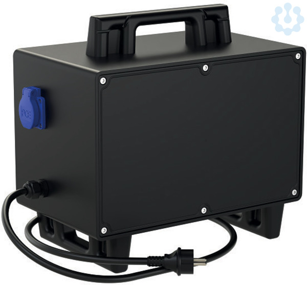 Mobiler Vollgummiverteiler Modell SCHREMS IP44/54 255x400x300; mit 1x Tragegriff oben und 2x Stellfüße unten (stapelbar); 3m Gerätel. H07RN-F 2G2,5mm2 m.VG-Kont.-Stecker 16A 2p 230V; 1xSK-Steckdose 16A 250V IP54 abgesichert d. Vorsicherung Zuleitung; 1xÜbertemperatursicherung 70 Grad C manuelle Rückstellung; 1xTrenntrafo 2.5kVA 230/230V prim.abges.ü. 1x therm. Schutzschalter 11A 1p; 1xEinschaltstrombegrenzer 25A 2Ohm; Verteiler betriebsfertig angeschlossen