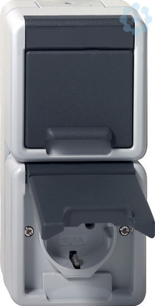 SCHUKO-Doppelsteckdose 16 A 250 V~ senkrecht mit Klappdeckel Grau WG AP Statt der SCHUKO-Steckdosen können in der senkrechten Kombination auch Schalter, Taster oder Lichtsignale eingesetzt werden.