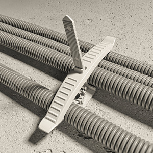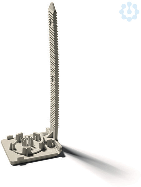 Für die trassenförmige Verlegung von flexiblen Rohrleitungen oder Mantelleitungen im Zuge der Direktmontage mit dem Bolzensetzgerät bzw. Gasnagler, für Decken und Rohbetonböden, der TB wird auf den Schuss-Traganker STA aufgerastet, auf einen STA können mehrere TB aufgestockt werden, die Verlegung ist in mehreren Etagen möglich, Material PA 6, UV-stabilisiert, halogenfrei, silikonfrei, Temperaturbereich 20 bis + 85 °C