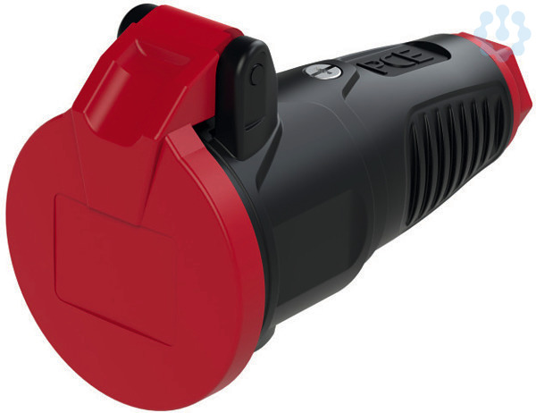 Schutzkontaktkupplung Serie TAURUS2 - Vollgummi mit Klappdeckel; Farbe (Haube/Ring/Deckel): schwarz/rot/rot; Material (Haube/Kontaktträger): TPE/TPE; Schutzkontaktsystem: österr./deutsch ; 16A / 250V AC / 3p (2P+E), Schutzart: IP54