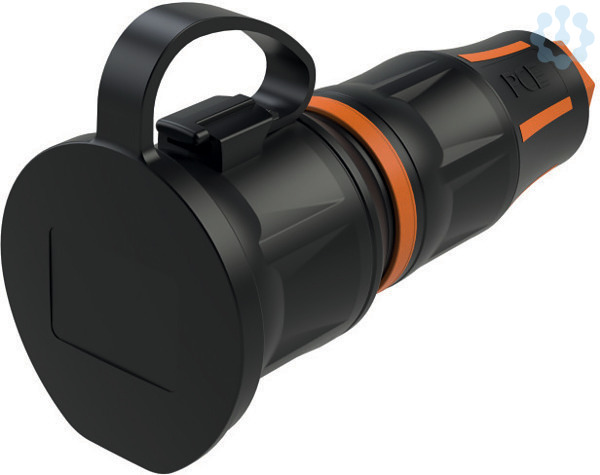 Schutzkontaktkupplung Serie TopTaurus2 mit Deckelband; Farbe: schwarz-orange, Material: PA6 2K gummiert; schraubenloses Schnellverschlusssystem für Gehäusehaube; Schutzkontaktsystem: franz./belg.; 16A / 250V AC / 3p (2P+E), Schutzart: IP54