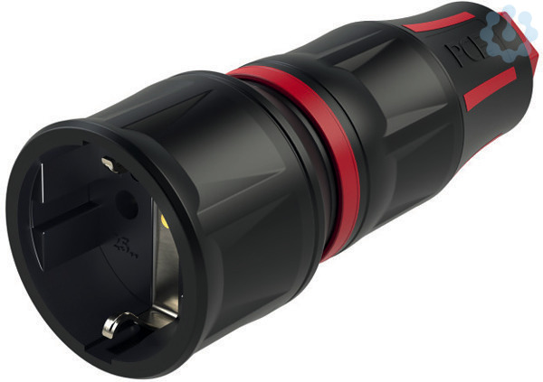 Schutzkontaktkupplung Serie TopTaurus2; Farbe: schwarz-rot, Material: PA6 2K gummiert; schraubenloses Schnellverschlusssystem für Gehäusehaube; Schutzkontaktsystem: österr./deutsch mit Shutter; 16A / 250V AC / 3p (2P+E), Schutzart: IP20