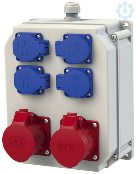 Kunstst.-Wandverteiler Modell SCHWAZ IP54 255x204x112; 1xM20 Verschraubung oben (Kabeldurchm. 10-14mm PG16) grau; 2xCEE-Steckdose 16A 5p 400V abgesichert d. Vorsicherung Zuleitung; 4xSK-Steckdose 16A 250V IP54 abgesichert d. Vorsicherung Zuleitung; Verteiler auf Vario-Connector 5polig 10qmm verdrahtet;