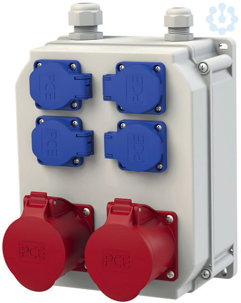 Kunstst.-Wandverteiler Modell SCHWAZ IP54 255x204x112; 1xM25 Verschraubung oben (Kabeldurchm. 13-18mm PG21) grau; 1xM20 Verschraubung oben (Kabeldurchm. 10-14mm PG16) grau; 2xCEE-Steckdose 32A 5p 400V abgesichert d. Vorsicherung Zuleitung; 4xSK-Steckdose 16A 250V IP54 abgesichert d. Vorsicherung Zuleitung; 2xCEE-Dosen 32/5 auf VC-Klemme 5polig verdrahtet; 4xSSD auf VC-Klemme 5polig verdrahtet;