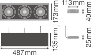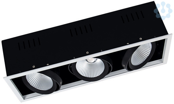 Schwenkbarer Einbaustrahler, dreiflammig. Produkteigenschaften: Großer facettierter Reflektor für hohe Lichtausbeute. Ausstrahlungswinkel: 38°. Kardanische Aufhängung: +/- 25°. Produktvorteile: Flimmerarmes Licht dank speziellem elektronischen Vorschaltgerät. Hohe Lichtausbeute. Abtrennung gegen andere Deckeneinbauten dank geschlossenem Stahlblechgehäuse. Einfacher Austausch des externen Treibers dank Stecker mit Bajonettverschluss. Funktionales und minimalistisches Design. 5 Jahre Garantie. Anwendungsgebiete: Akzent- und Allgemeinbeleuchtung für alle Arten von Verkaufsräumen. Modegeschäfte, Accessoiresgeschäfte. Shops, Boutiquen. Hotelzimmer. Cafés. Technische Ausstattung: Treiber inbegriffen.
