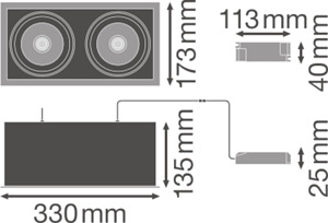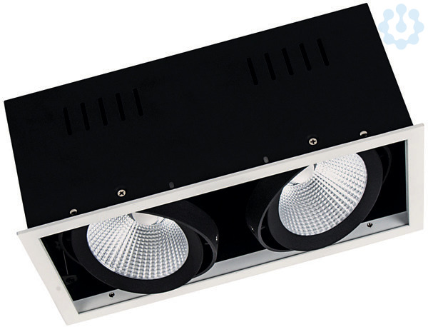 Schwenkbarer Einbaustrahler, zweiflammig. Produkteigenschaften: Großer facettierter Reflektor für hohe Lichtausbeute. Ausstrahlungswinkel: 38°. Kardanische Aufhängung: +/- 25°. Produktvorteile: Flimmerarmes Licht dank speziellem elektronischen Vorschaltgerät. Hohe Lichtausbeute. Abtrennung gegen andere Deckeneinbauten dank geschlossenem Stahlblechgehäuse. Einfacher Austausch des externen Treibers dank Stecker mit Bajonettverschluss. Funktionales und minimalistisches Design. 5 Jahre Garantie. Anwendungsgebiete: Akzent- und Allgemeinbeleuchtung für alle Arten von Verkaufsräumen. Modegeschäfte, Accessoiresgeschäfte. Shops, Boutiquen. Hotelzimmer. Cafés. Technische Ausstattung: Treiber inbegriffen.