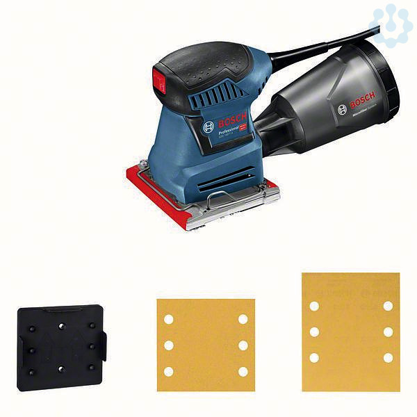 Schwingschleifer GSS 140-1 A, Karton; Lochwerkzeug (2 608 190 059); Schleifpapier 120 K; Staubbox (2 605 411 240) inkl. Microfilter (2 605 411 241); 1 x Schleifblatt C470, Best for Wood + Paint, 120 (separat erhältlich als 10er-Pack: 2 608 607 458); Grundplatte, 113 x 101 mm (2 608 601 446) mit Schleifplatte (2 608 601 443)