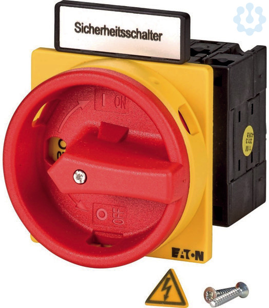 Sicherungslasttrennschalter SUVA, Sortiment: Sicherheitsschalter SUVA, Typkenner: T3, STOPP-Funktion: NOT-AUS-Funktion, mit rotem Drehgriff und gelbem Sperrkranz, Hinweis: mit Warnschild „Sicherheitsschalter”, Abschließbarkeit: abschließbar in 0-Stellung, Schutzart: Front IP65, Bauform: Einbau, Bemessungsbetriebsleistung AC-23A, 50 - 60 Hz 400 V: P = 15 kW, Bemessungsdauerstrom: Iu = 32 A, 2 Baueinheit(en), Normen und Bestimmungen: IEC/EN 60947, VDE 0660, IEC/EN 60204, Lasttrennschalter nach IEC/EN 60947-3