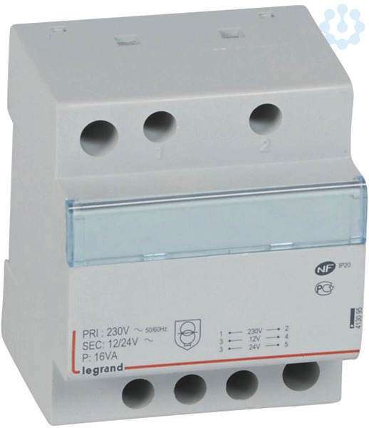 Legrand Sicherheitstransformator, 4-modulig, Primärspannung 230 V/ 50 Hz, Sekundärspannung AC 230 V/12 V oder 24 V, Leistung 16 VA, Sicherheitstransformator nach EN 61558-2-6, für Dauerlasten geeignet. Integrierter Kurzschluss und Überlastschutz, mit Beschriftungsfenster, Befestigung auf Hutprofilschiene EN 60715 duch rastende Schnellbefestigung.