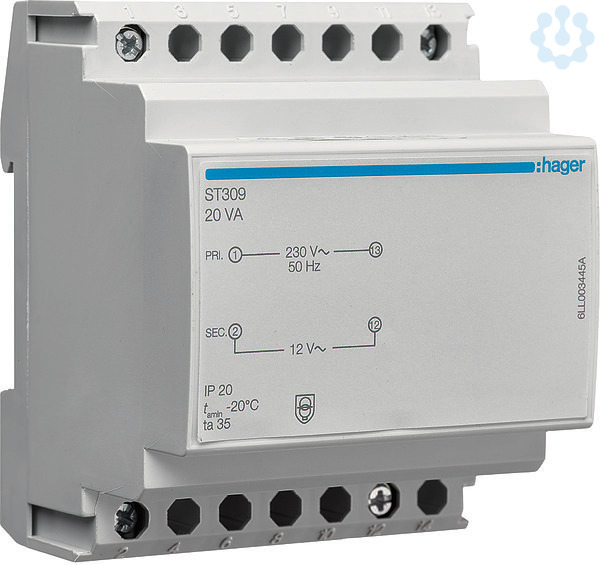 Sicherheitstrafo 230V/12V, 20VA, 4PLE.Sicherheitstransformator mit getrennter Primär- und Sekundärwicklung. Schutz gegen Kurzschluss oder Überlast erfolgt durch einen integrierten thermischen Schalter auf der Primärseite.
