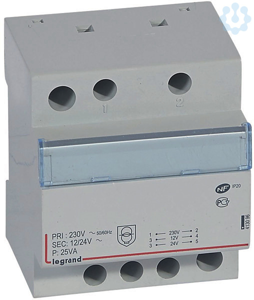 Legrand Sicherheitstransformator, 5-modulig, Primärspannung 230 V/ 50 Hz, Sekundärspannung AC 230 V/12 V oder 24 V, Leistung 25 VA, Sicherheitstransformator nach EN 61558-2-6, für Dauerlasten geeignet. Integrierter Kurzschluss und Überlastschutz, mit Beschriftungsfenster, Befestigung auf Hutprofilschiene EN 60715 duch rastende Schnellbefestigung.