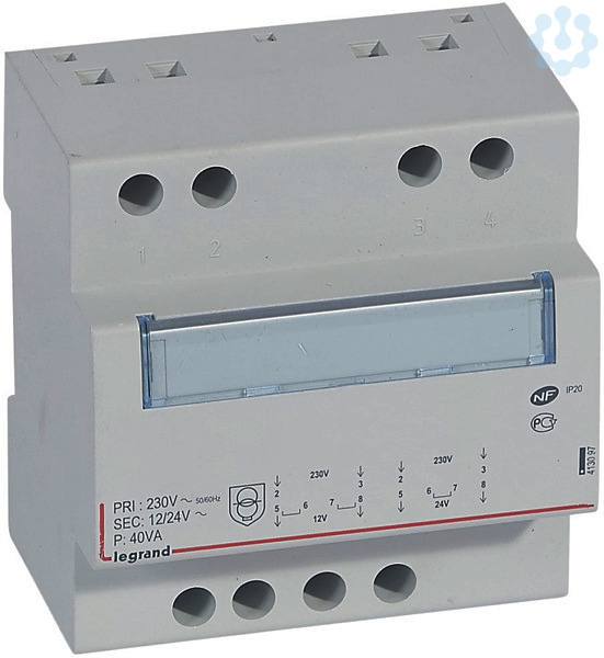 Legrand Sicherheitstransformator, 5-modulig, Primärspannung 230 V/ 50 Hz, Sekundärspannung AC 230 V/12 V oder 24 V, Leistung 40 VA, Sicherheitstransformator nach EN 61558-2-6, für Dauerlasten geeignet. Integrierter Kurzschluss und Überlastschutz, mit Beschriftungsfenster, Befestigung auf Hutprofilschiene EN 60715 duch rastende Schnellbefestigung.