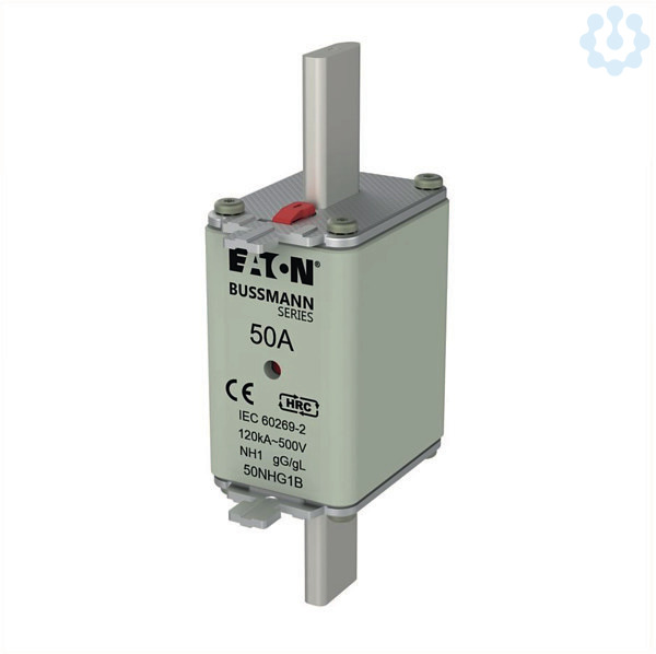 Sicherung, Sicherungseinsatz, Niederspannung, 50 A, AC 500 V, NH1, gL/gG, IEC, Doppelkennmelder, quadratischer Körper mit Messerkontakten, spannungsführende Grifflasche, IEC 60269-2 Sicherungssystem A, DIN 43620, VDE 0636-2, Ausschaltvermögen 120 kA, Zubehör optional Sicherungshalter SD1-D