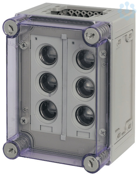 Sicherungs-Verteilergehäuse, Material Polycarbonat, schlagfest, Schutzart IP65, Seitenwände geschlossen, ausschlagbar, Wände oben und unten offen, Deckel durchsichtig rauchgrau mit Griffverschlüssen, Berührungsschutzabdeckung mit Beschriftungsstreifen, plombierbare Deckelverschlüsse, mit dreipoligen Reitersicherungsunterteilen auf Sammelschienen, von vorne austauschbar, Bemessungsbetriebsstrom Ie=63A, max. Sicherungseinsatz 35A, DIII/E33, abgesicherte Stromkreise Anzahl 2x3-polig