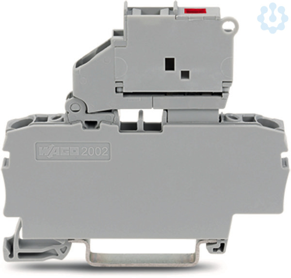 2-Leiter-Sicherungsklemme; mit schwenkbarem Sicherungshalter; mit Abschlussplatte; für G-Sicherungseinsatz 5 x 20 mm; mit Defektanzeige durch LED; 120 V; für Tragschiene 35 x 15 und 35 x 7,5; 2,5 mm²; Push-in CAGE CLAMP®; 2,50 mm²; grau