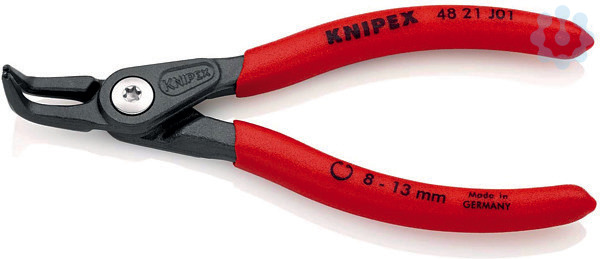 48 21 J01 Präzisions-Sicherungsringzange hoch belastbar im Dauereinsatz: bis zu 10-fach höhere Standzeit gegenüber angedrehten Spitzen. Mit eingesetzten Spitzen für sicheres Arbeiten. Geschraubtes Gelenk: präziser, spielfreier Gang der Zange. Rutschhemmender Kunststoffüberzug an den Griffen. gewinkelte Spitzen. - Kapazität für Bohrungsdurchmesser: Ø 8 – 13mm - Spitzen (Durchmesser): Ø 0,9mm