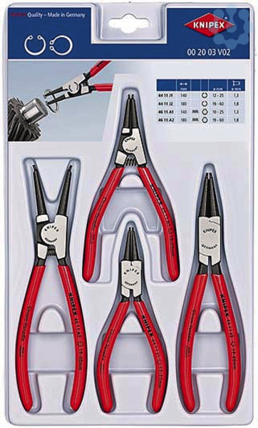 00 20 03 V02 Sicherungsringzangen-Set Attraktive Verkaufsverpackung mit SB-Lochung. Stabile Kunststoffverpackung; auch zur weiteren Aufbewahrung der Zangen geeignet. Bestückt mit gängigen Sicherungsringzangen für Innen- und Außenringe. 4-teilig. SB-Karte/Blister. Lieferumfang: 1 x 44 11 J1 KNIPEX Sicherungsringzange für Innenringe in Bohrungen (Ø 12 - 25 mm), 1 x 44 11 J2 KNIPEX Sicherungsringzange für Innenringe in Bohrungen (Ø 19 - 60 mm), 1 x 46 11 A1 KNIPEX Sicherungsringzange für Außenringe auf Wellen, 1 x 46 11 A2 KNIPEX Sicherungsringzange für Außenringe auf Wellen,