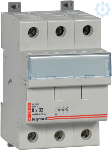 Legrand Sicherungstrenner, 3-polig, für Zylindersicherungen 8,5 x 31,5 mm, Bemessungsspannung 400 VAC, Bemessungsskurzschlussstrom Icc 20 kA, Befestigung auf Hutprofilschiene EN 60715. Sicherungstrenner nach IEC 60269-2, IEC 60947-3.