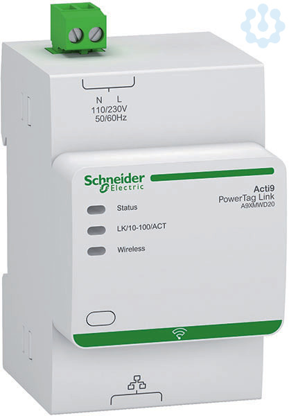 Verbindungsgateway Ethernet (Modbus TCP) für drahtlose Energiezähler. PowerTag mit Webseiten für die Datenanzeige. Die angeschlossenen PowerTags ermöglichen die Alarmverwaltung über E-Mail für die Endlasten sowie genaue Echtzeit-Messungen der Energien, Leistungen, Stromstärken und Spannungen. Das vollständige System kann einfach mittels Leistungsschalter des Typs Multi 9 / Acti 9 in die vorhandenen Schaltanlagen integriert werden. Montage auf Hutschiene, 2 Teilungseinheiten. Betriebstemperatur -25 bis +55 °C. Versorgungsspannung 110/230 V AC ± 15 %, 2 A, Frequenz 50/60 Hz, Stromverbrauch 5 VA.