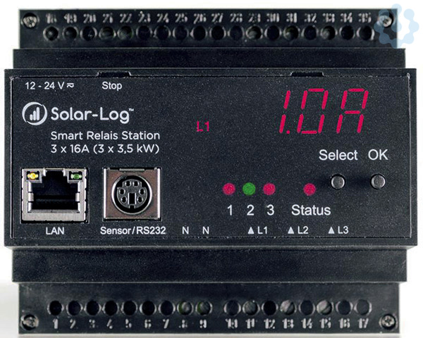 Die potenzialfreien Relais der Solar-Log™ Smart Relais Station eignen sich für die Ansteuerung von Motoren, Pumpen, Lüftungs- und Klimaanlagen sowie Trocknungs- und Belüftungsanlagen, d.h. für Verbraucher mit zeitlich verschiebbar Lasten. Der Solar-Log™ erhält dabei von jedem einzelnen Relais eine Rückmeldung über die Verbrauchswerte. Die Kommunikation zwischen der Solar-Log™ Smart Relais Station und der Solar-Log™ Geräteserie erfolgt über die Netzwerkschnittstelle RJ45 (TCP/IP). Erweiterte Anschlussmöglichkeiten bietet die Solar-Log™ Smart Relais Station 3 x 3,5 kW. Mit dem Solar-Log™ können insgesamt bis zu 10 Verbraucher, d.h. 3 x 3 plus 1 Verbraucher angesteuert werden.