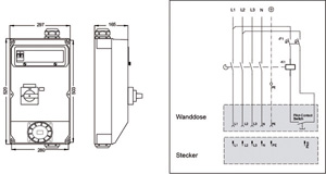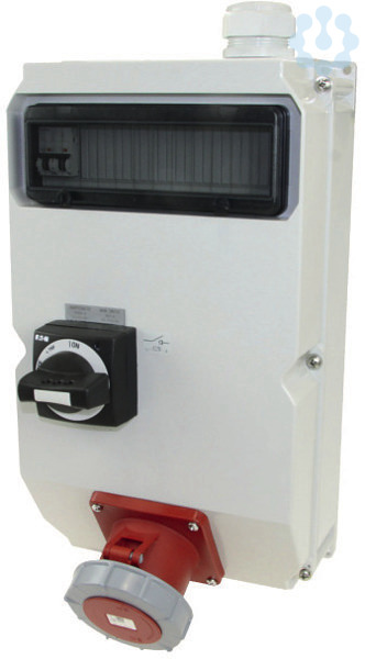 Kunstst.-Wandverteiler Modell SÖLDEN IP66 520x297x165 13TE; aussenliegenden Wandbefestigungslaschen; 1xM63 Verschraubung oben (Kabeldurchm. 34-44mm PG48) sch.; 1xBlindverschraubung M63 unten; 1xCEE-Steckdose 125A 5p 400V mit PCS System abgesichert über; Lasttrennschalter 125A 4polig mit Unterspannungsauslösung (eingestellt auf 125A); Steuerstromkreis abgesichert ü. LS 2A 2p C; Schalter Fabrikat Eaton ÖVE / VDE TYP NZM1 thermomagn.Ausl; Leitungsschutzschalter Fabrikat Eaton ÖVE / VDE; Verteiler auf Reihenklemmen 5x50qmm verdrahtet; Funktion: Durch das PCS System in Verbindung mit dem; Laststrennschalter inkl. unterspannungsauslösung wird das; spannungslose Stecken/Ziehen an der 125A Dose gewährleistet; Zusätzlich ist die Dose gegen automatisches Wiedereinschalten; nach Spannungsausfälle der Zuleitung gesichert